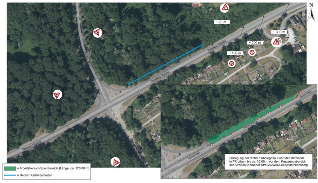 Die Teilsperrung bedeutet, dass ein Abbiegen von der Zwolle-Allee links in die Richtung Beckinghausen weiterhin möglich ist. Das Rechtsabbiegen Richtung Lünen ist aufgrund der Vollsperrung durch die Brückenarbeiten nicht möglich. Von Beckinghausen / Hammer Straße kommend Richtung Lünen ist die Fahrspurnutzung der Kamener Straße bis zur eingerichteten Teilsperrung möglich (s. Karte).